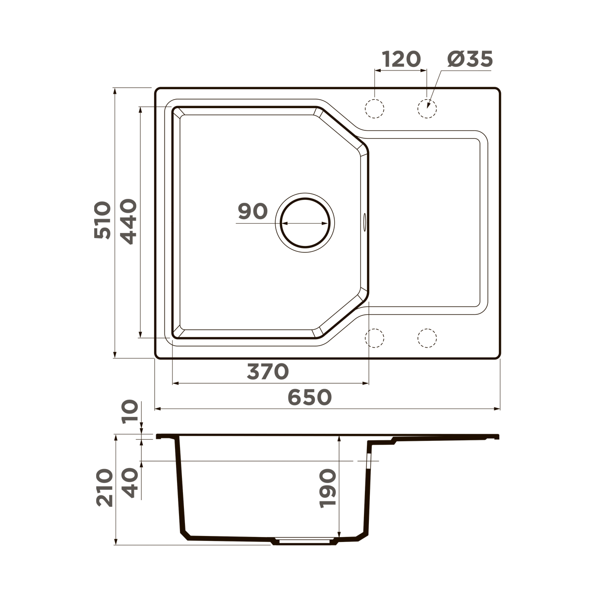 Модель оснащена одной основной чашей размером 370×440 мм и глубиной 190 мм, а также дополнительной чашей глубиной 120 мм, что обеспечивает удобство и комфорт при использовании. Эта мойка предназначена для накладного типа установки и имеет толщину 10 мм.