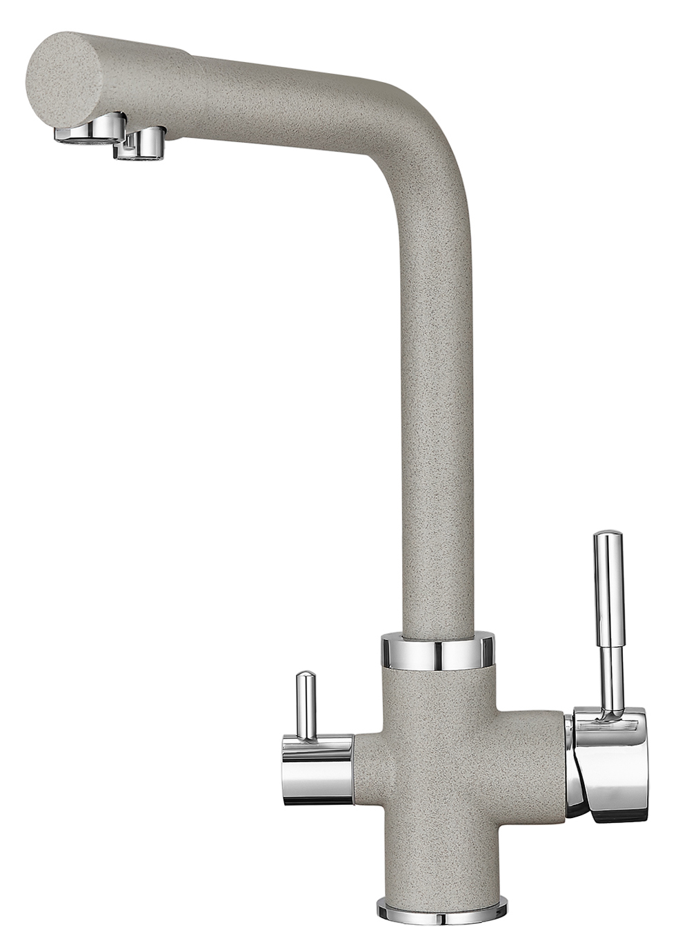 Смеситель для кухонной мойки Granula 2015 изготовлен из высококачественного материала. Латунный корпус обеспечивает длительный срок службы. При этом высокий излив позволяет мыть как мелкую, так и крупногабаритную посуду. Двухрычажная модель смесителя Granula 2015 выполнена с краном для питьевой воды. Фильтрованная вода подается по отдельной трубке и не смешивается с водопроводной водой.
