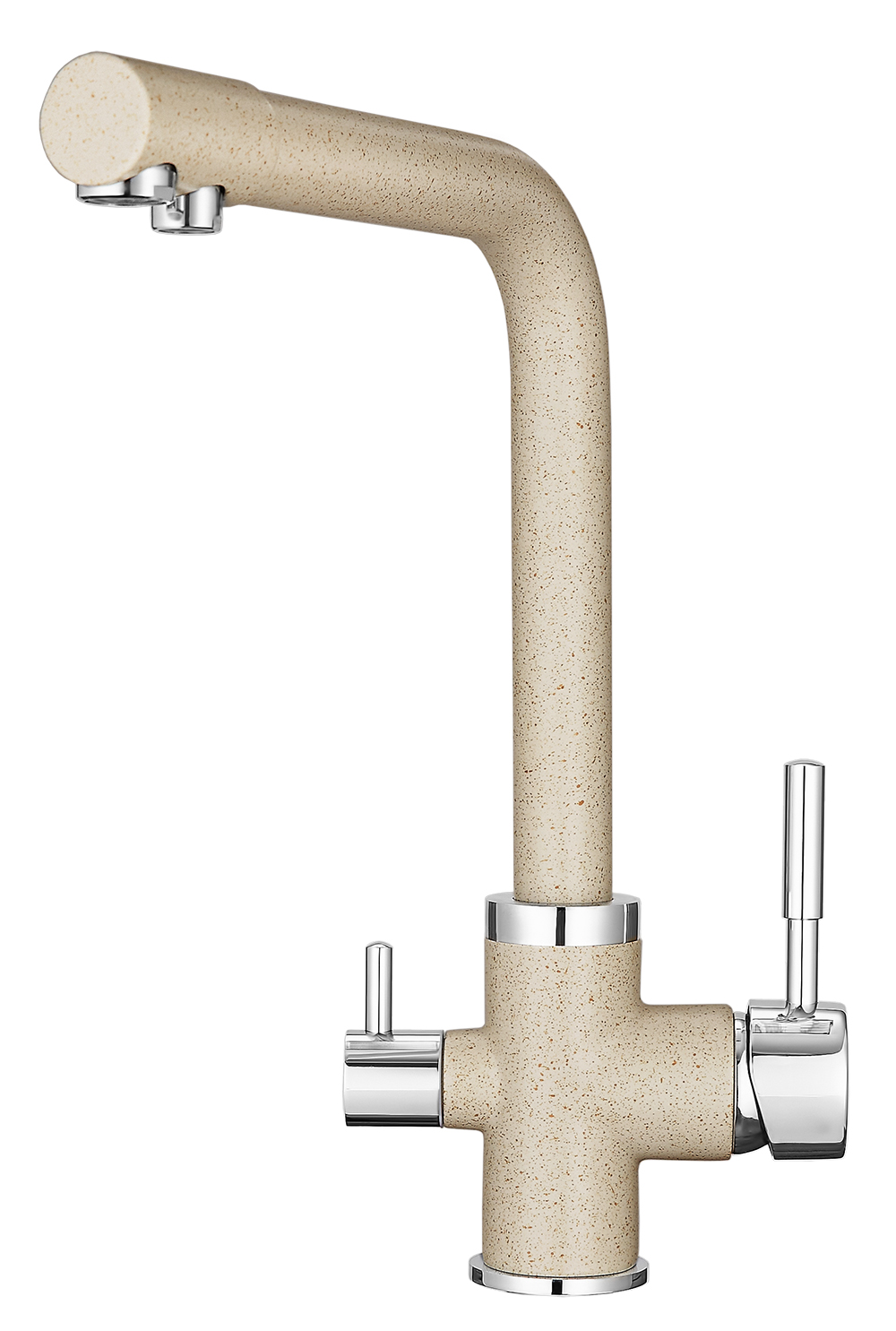 Смеситель для кухонной мойки Granula 2015 изготовлен из высококачественного материала. Латунный корпус обеспечивает длительный срок службы. При этом высокий излив позволяет мыть как мелкую, так и крупногабаритную посуду. Двухрычажная модель смесителя Granula 2015 выполнена с краном для питьевой воды. Фильтрованная вода подается по отдельной трубке и не смешивается с водопроводной водой.