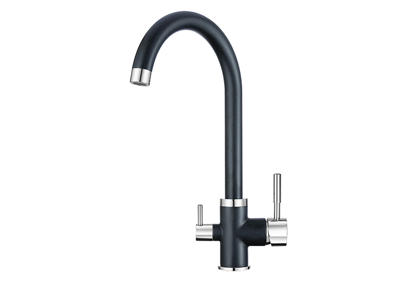 Смеситель для кухонной мойки Granula 2168 изготовлен из высококачественного материала. Латунный корпус обеспечивает длительный срок службы. При этом высокий излив позволяет мыть как мелкую, так и крупногабаритную посуду. Двухрычажная модель смесителя Granula 2168 выполнена с краном для питьевой воды. Фильтрованная вода подается по отдельной трубке и не смешивается с водопроводной водой.