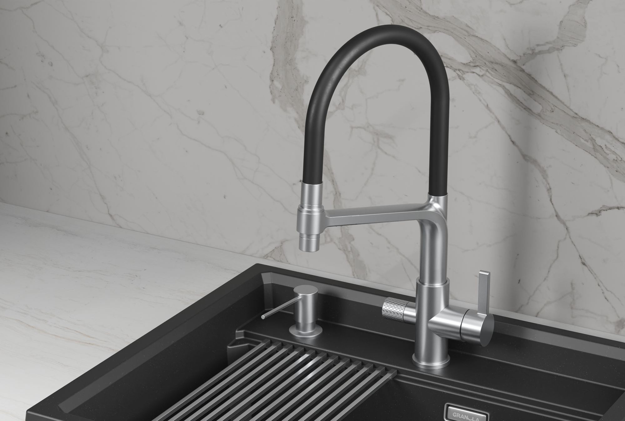 Этот современный смеситель из нержавеющей стали SUS304 станет настоящим украшением Вашей кухни. Гибкий силиконовый излив позволяет направлять струю воды в любую точку мойки, а рычажное управление обеспечивает плавную регулировку температуры и напора.