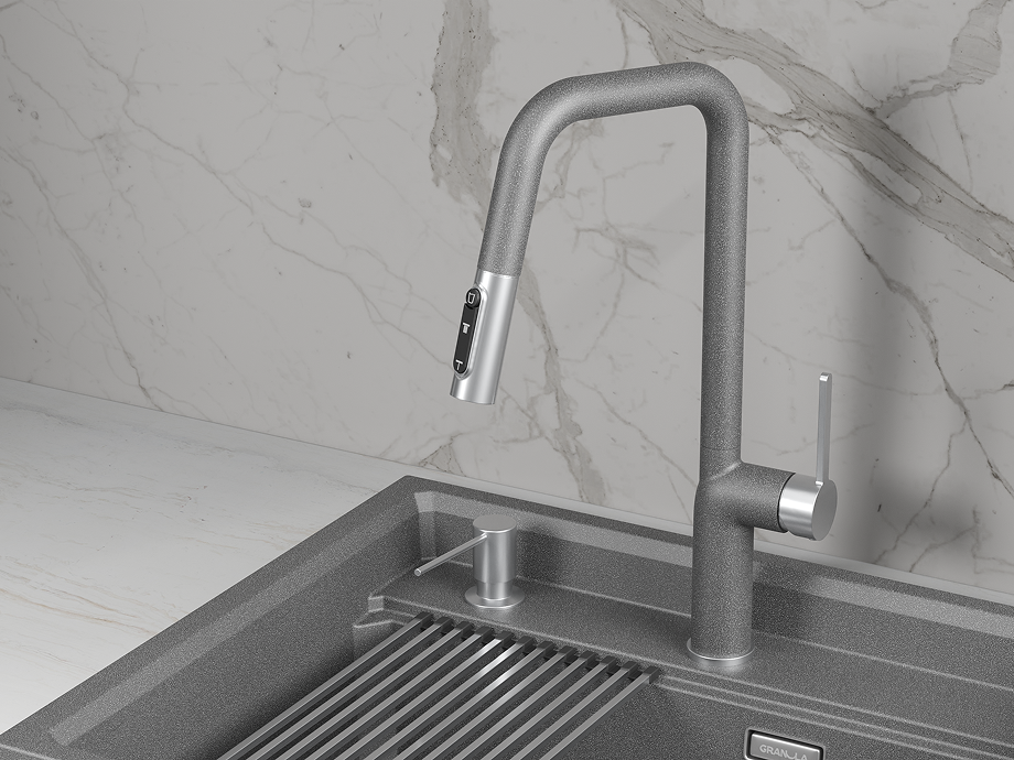 Смеситель оснащен удобным рычажным управлением и поворотным изливом, что обеспечивает легкость в использовании. Выдвижной излив позволяет удобно мыть посуду и наполнять большие кастрюли. Кроме того, предусмотрена возможность подключения к фильтру для чистой питьевой воды.