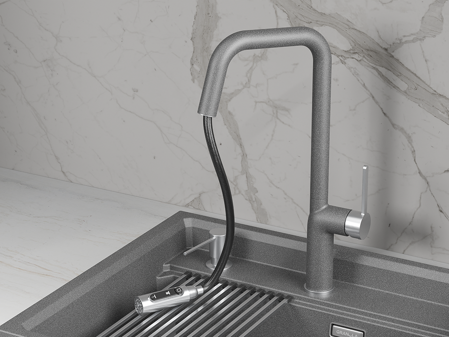 Кухонный смеситель GRANULA с выдвижным изливом с переключением на душ и подключением к фильтру GR-9011, ГРАФИТ (ЧЁРНО-СЕРЫЙ)