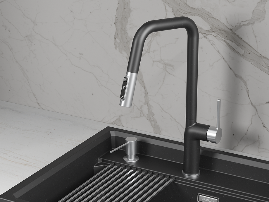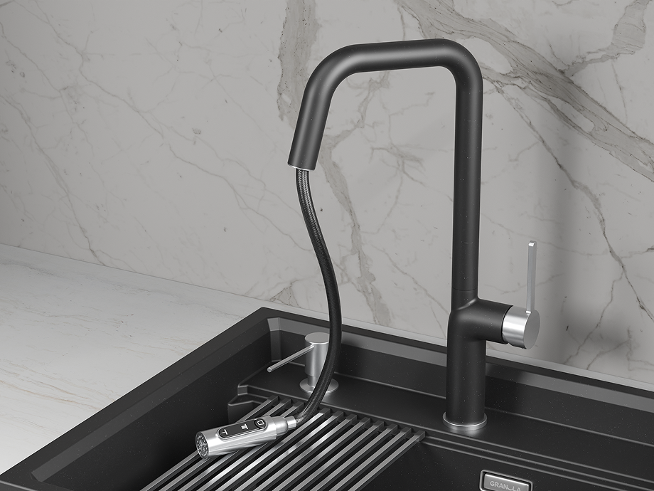 Кухонный смеситель GRANULA с выдвижным изливом с переключением на душ и подключением к фильтру GR-9011, ШВАРЦ