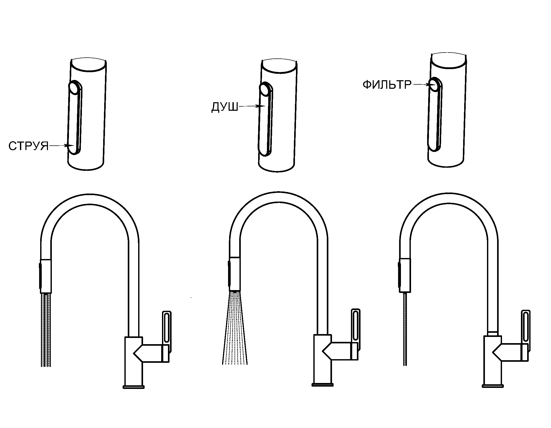 Переключение между режимами подачи воды (фильтр, душ, лейка) – позволяет снизить расход воды, легче мыть посуду и экономить пространство.