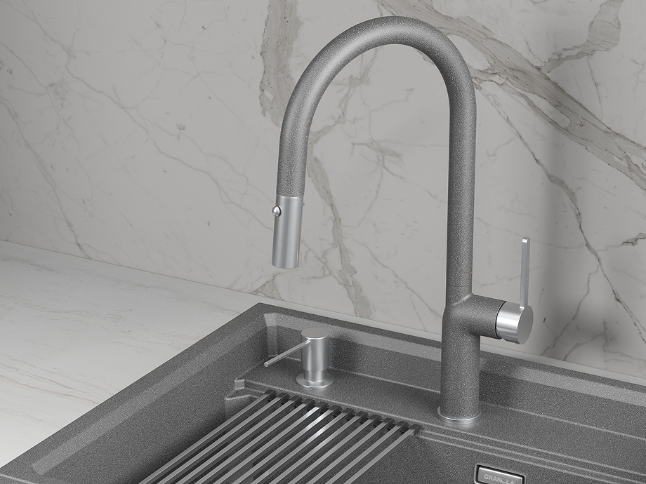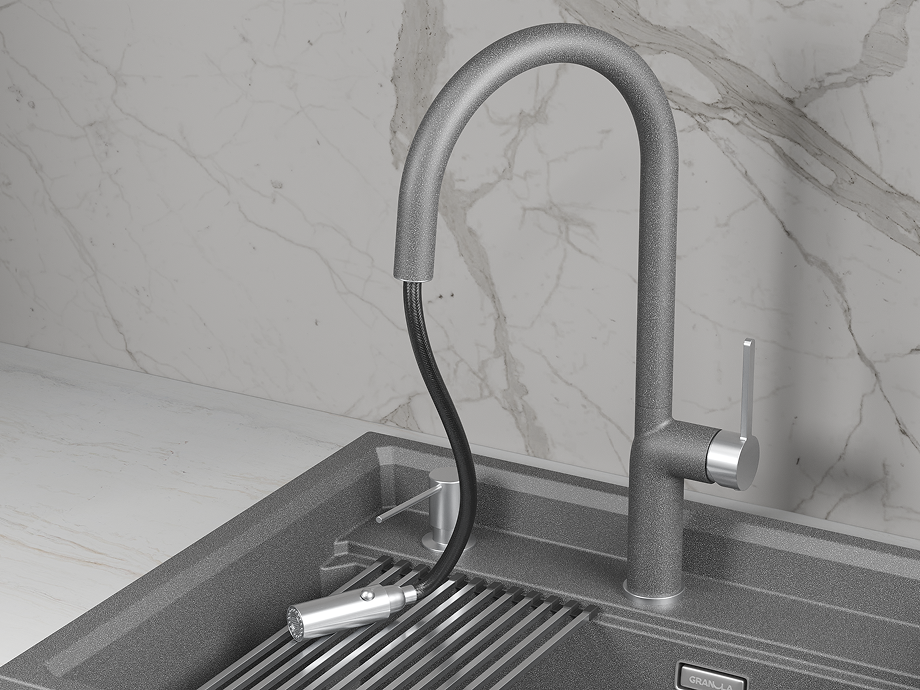 Кухонный смеситель GRANULA с выдвижным изливом и переключением на душ GR-9010, ГРАФИТ (ЧЁРНО-СЕРЫЙ)