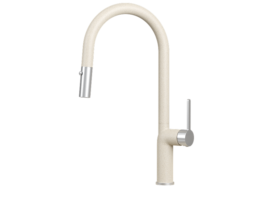 Смеситель оснащен удобным рычажным управлением и поворотным изливом, что позволяет легко регулировать поток воды. Выдвижной излив добавляет дополнительную гибкость в использовании, а режимы подачи воды — струя и душ — делают его идеальным для любых кухонных задач.