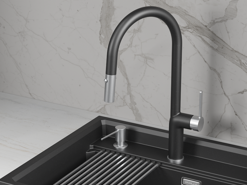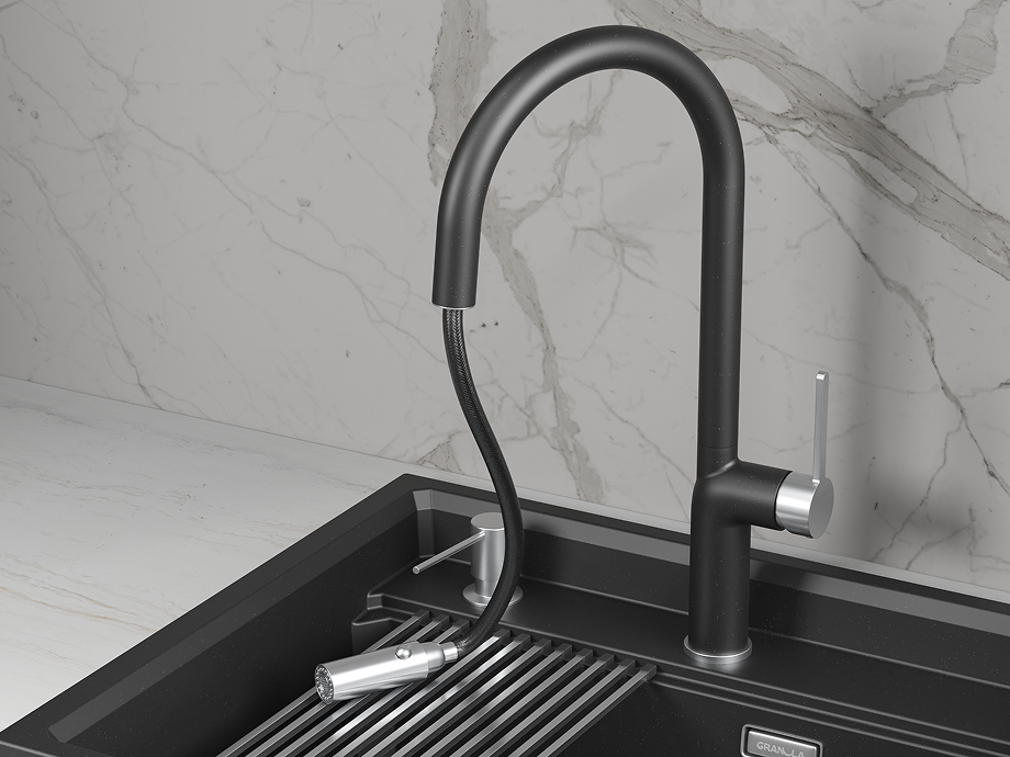 Кухонный смеситель GRANULA с выдвижным изливом и переключением на душ GR-9010, ШВАРЦ