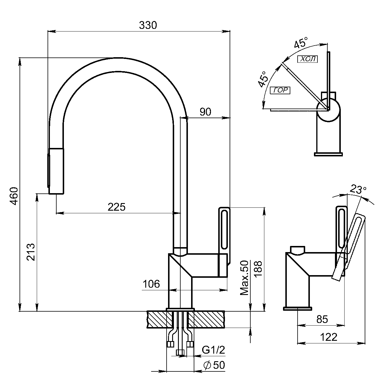 Выдвижной излив – увеличивает охват рабочей зоны и позволяет легко дотянуться до труднодоступных мест.